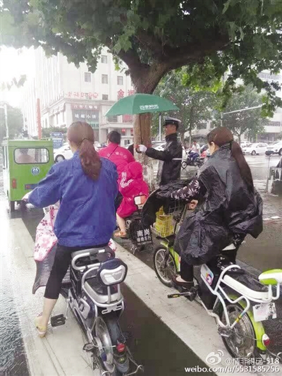 昨日,网友“情非得已-518”的一张图片受到了网友们的热传点赞。图片显示,在雨中,一名交警为一对骑电动车的母女撑起了一把雨伞。当时,骑电动车的母女未穿雨衣,似乎正在等红灯。