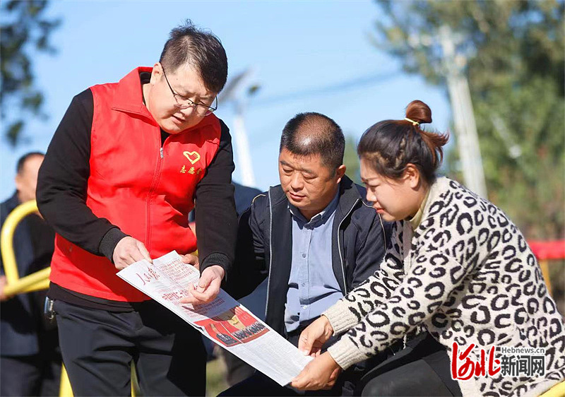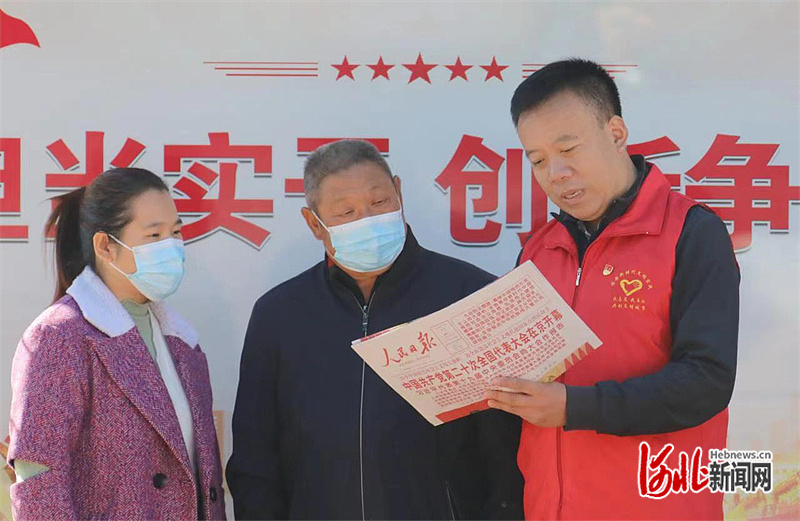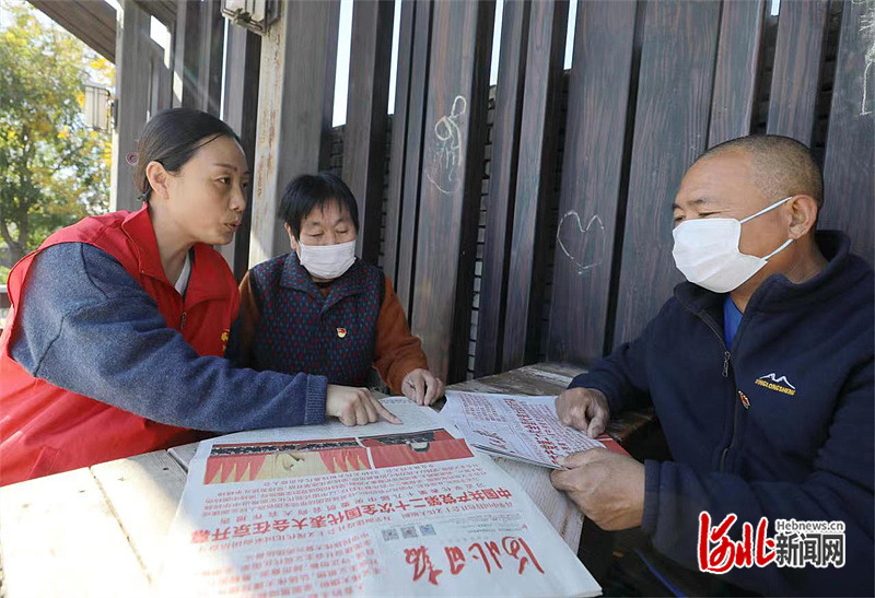 图为在固安县渠沟镇周家务村,党员志愿者向群众宣传讲解党的二十大报告内容。通讯员吴迪 摄
