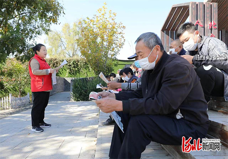 图为在固安县渠沟镇周家务村,党员志愿者向群众宣传讲解党的二十大报告内容。通讯员肖靖凯 摄