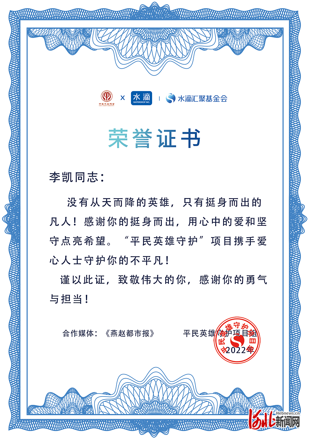 慷慨燕赵,勇士辈出,没有从天而降的英雄,只有挺身而出的凡人。守望相助是中华民族的传统美德,2021年初,水滴公益联合中华慈善总会启动“平民英雄守护计划”。目前,该项目已联合全国多家主流媒体向106人颁发“平民英雄”荣誉,累计支出帮扶慰问资金42万余元。下一步,项目将继续联合广大爱心媒体和大众的力量,发现、寻找身边身处困境、不畏艰险、积极向上的人,一同传播正能量,向城市中的“平民英雄”致敬。