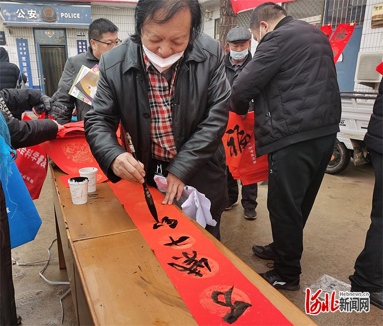 书法老师们凝神聚气,泼墨挥毫,一会儿工夫,一副副苍劲有力、喜庆吉祥的大红春联便展现在人们眼前,清新的墨香、祝福的言语,在传递浓浓年味的同时,也给村民们送去了新春的问候。