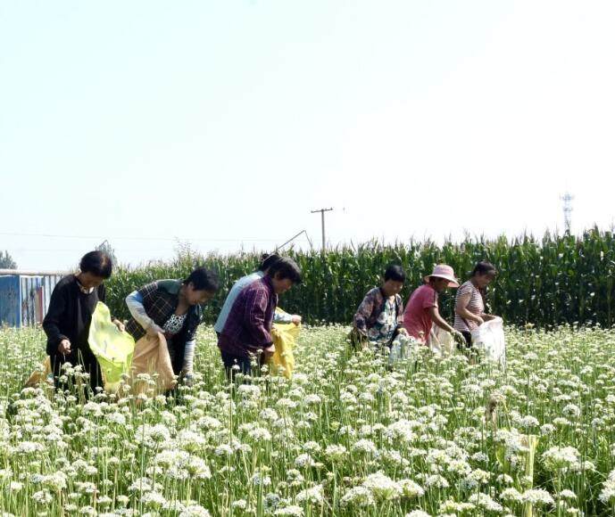 近日,河北定州市丁绿农产品销售专业合作社的300余亩韭菜花竞相绽放,工人们正利用晴朗天气加紧采摘韭菜花,田间地头呈现一派繁忙景象。