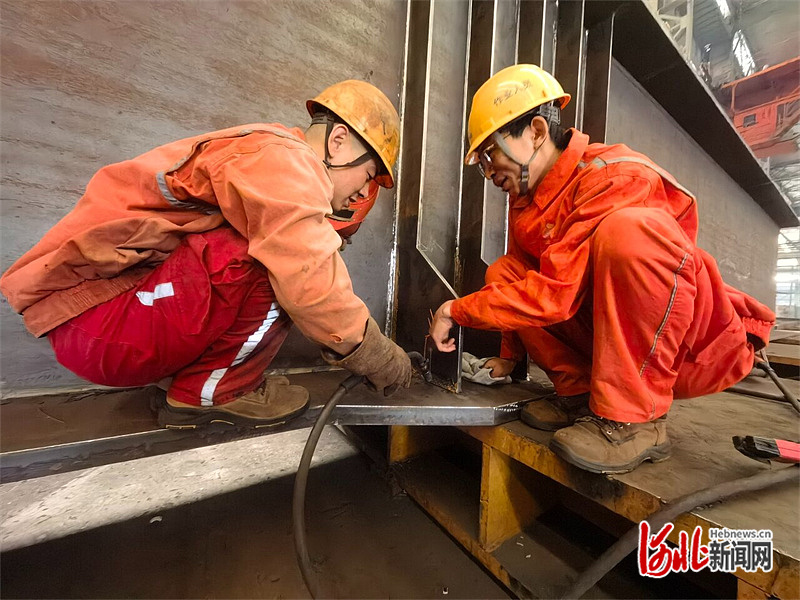 4月30日,张明(右)和同事商讨特殊位置焊接方法。 河北日报记者 孙也达摄