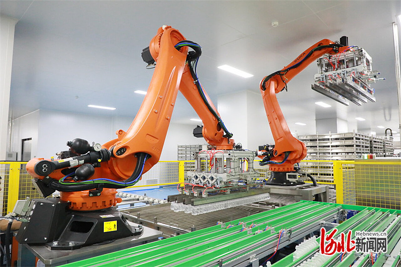 5月14日,在石四药数智化直立式软包装输液生产车间灭菌岗位,自动化装车机器人正在夹取、码放产品。尹旭广摄